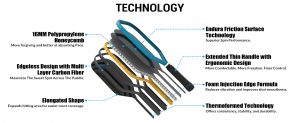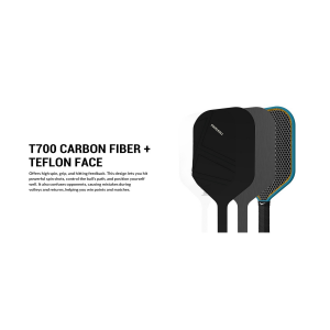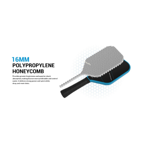 Carbon fiber paddle with a textured T700 strike surface for reliable spin and control. A 16 mm polypropylene honeycomb core helps reduce vibration, while the edgeless, multi-layer build and long handle (≈5.78 in) support two-handed backhands. Cushioned 4-1/8″ grip for comfort.