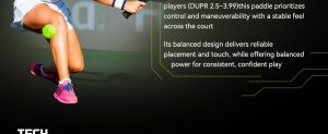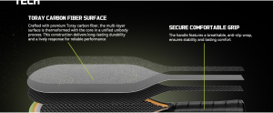 Lightweight paddle featuring a Toray T700 carbon fiber strike surface for confident control and spin. The 16 mm hybrid polypropylene-foam core helps dampen vibration, while the thermoformed unibody construction adds stability. Elongated, sweat-absorbing cushioned grip (≈5.5″ length, 4.125″ circumference) supports two-handed backhands. Adult, unisex; standard elongated shape.